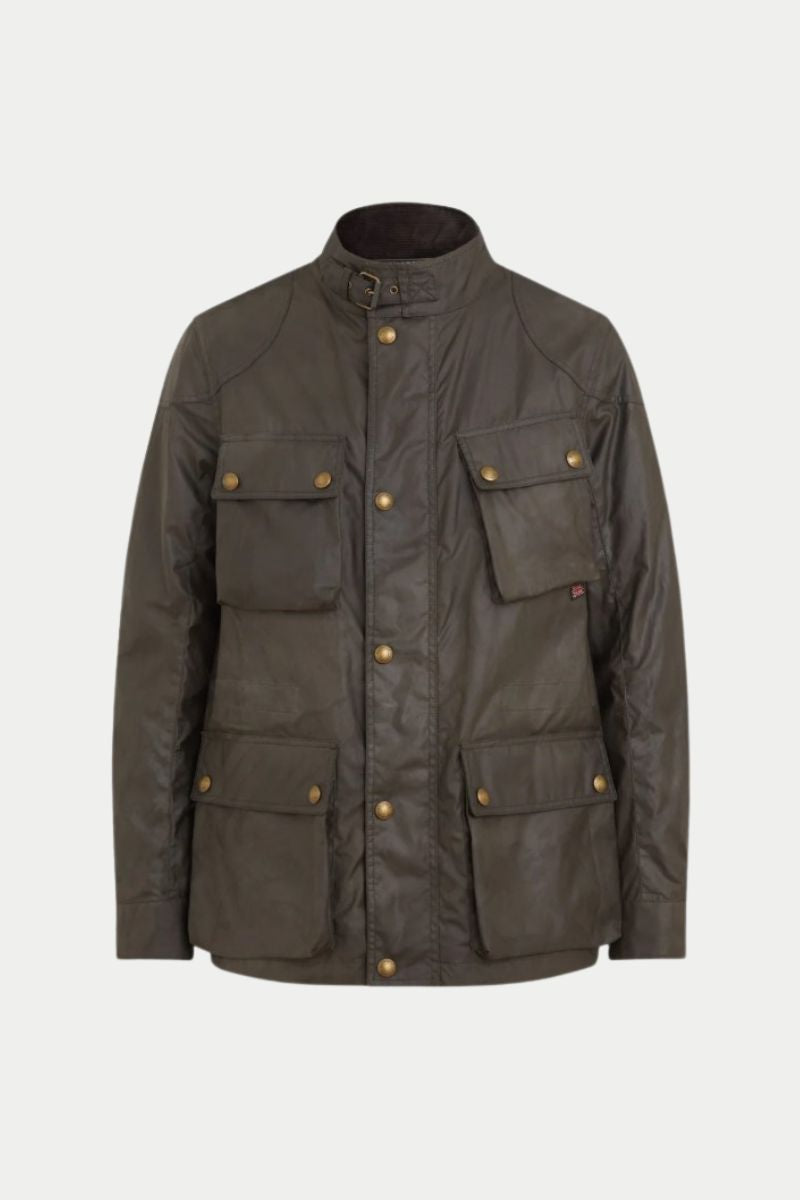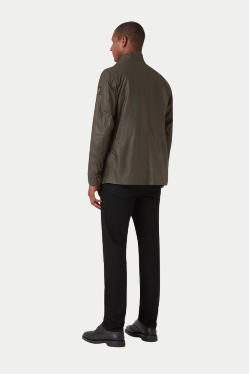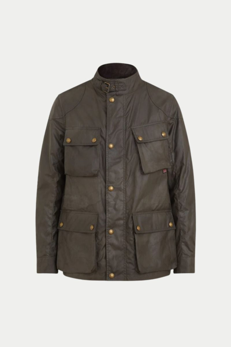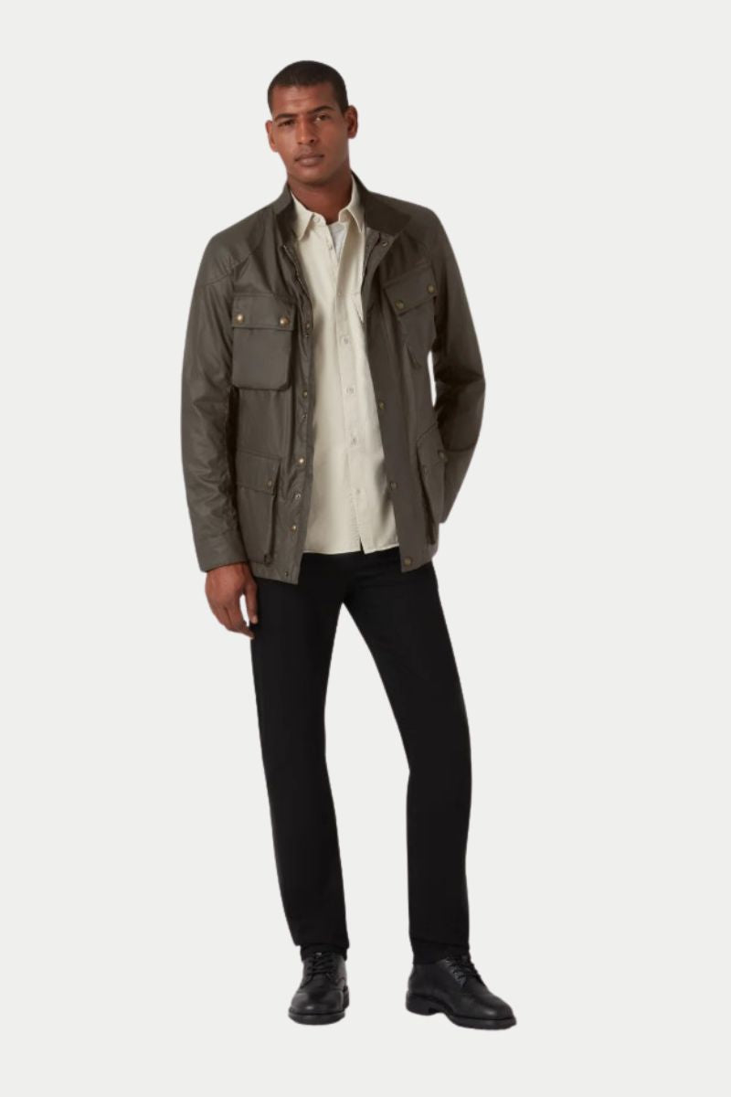 La chaqueta belstaff está disponible en verde oliva y negro.