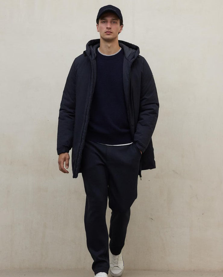La chaqueta de Ecoalf está disponible en color azul marino y beige.